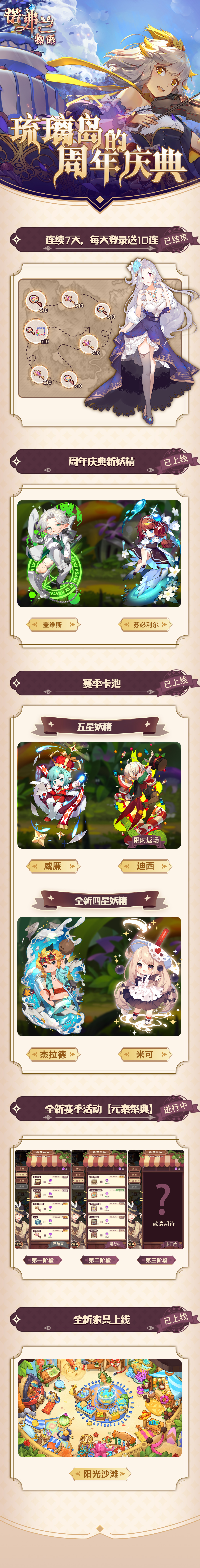 编辑最后更新 2025年12月23日,琉璃岛的周年庆典如火如荼进行中【全新玩法】元素祭典赛季开启【限时角色】全新妖精限时上线【卡池更新】周年限定卡池开启【皮肤系统】妖精皮肤功能上线【家具上新】全新家具限定上线【福利放送】老玩家回归功能解锁